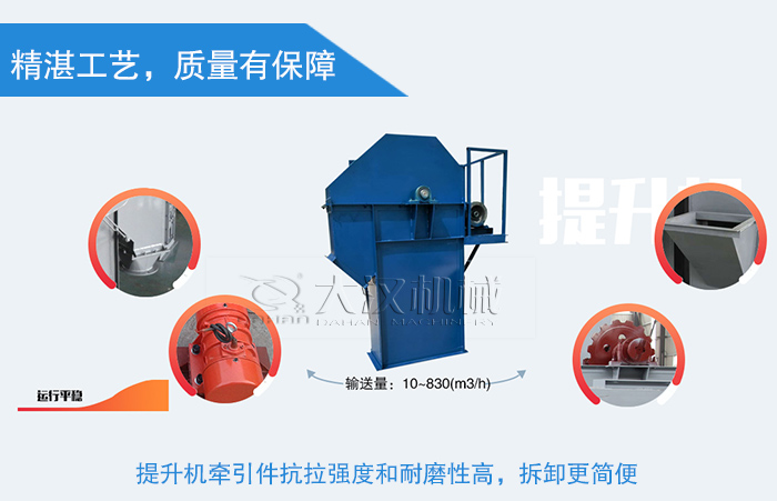 大漢粉料斗式提升機(jī)適用輸送堆積密度不大于噸/米 3 的物料的粉狀物料,輸送量5.4-2m3/h,提升高度大能達(dá)到40m。