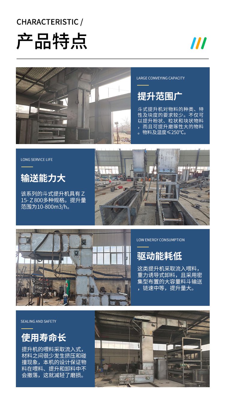 Z型提升機由于其組成靈活多變,機身緊湊,水平-垂直-水平輸送方式,大大減少了設(shè)備占地較大的情況。
