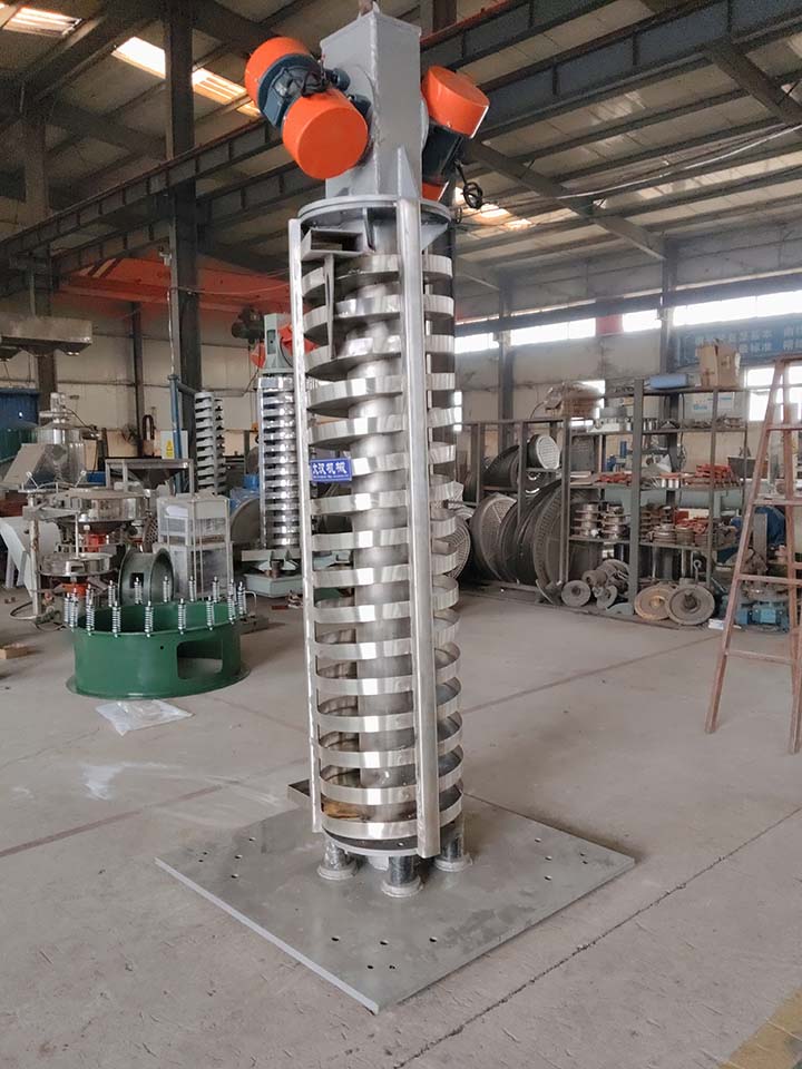 產品簡介:不銹鋼垂直振動提升機是對食品、醫藥等對衛生要求比較嚴格、或者是有腐蝕性的顆粒狀、塊狀、粉狀的固體物料的輸送,是我廠生產的一種新型的垂直振動輸送設備。采用振動電機作振動源,利用兩振動電機的合成振幅,將物料沿螺旋輸送槽向上輸送。