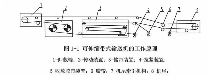 可伸皮帶輸送機與普通膠帶輸送機的工作原理一樣,是以膠帶作為牽引承載機的連續運輸設備,它與普通膠帶輸送機相比增加了儲帶裝置和收放膠帶裝置等,當游動小車向機尾一端移動時,膠帶進入儲帶裝置,機尾回縮;反之則機尾延伸,因而使輸送機具有可伸縮的性能。